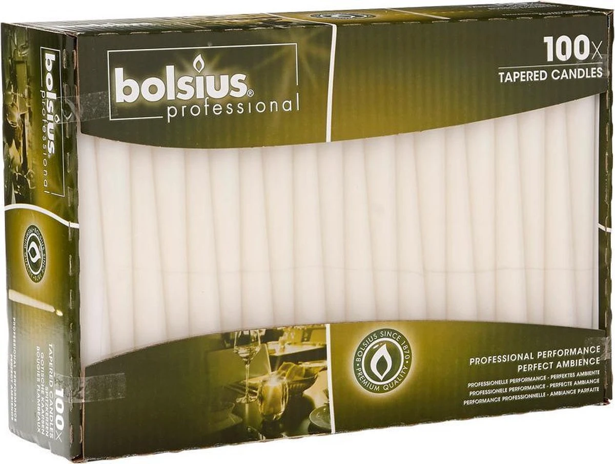 100 stuks ivoor-kleurige spits toelopende Bolsius gotische dinerkaarsen 240/23 als voordeel verpakking. Deze ivoor kaarsen walmen nauwelijks en hebben ook een zeer beperkte kans op druipen. De gotische kaarsen zijn verkrijgbaar in verschillende klassieke kleuren. De ivoor Bolsius kaarsen hebben een slanke, gladde voet, waardoor ze makkelijk pas te maken zijn en geschikt zijn voor verschillende houders. De lont is van katoen en zorgt voor perfect rustige brandeigenschappen. Brandduur 7 uur. Kleur ivoor. Merk Bolsius met de lengte 240 mm en diameter 23 mm. De perfecte chique kaars op de gedekte tafel. Bestel aantal 1 = 100 stuks
