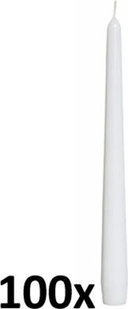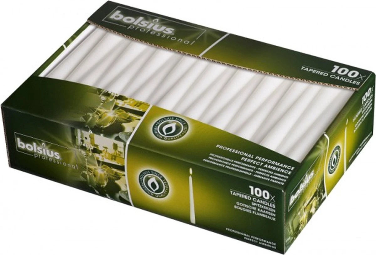 100 stuks wit-kleurige spits toelopende Bolsius gotische dinerkaarsen 240/23 als voordeel verpakking. Deze witte kaarsen walmen nauwelijks en hebben ook een zeer beperkte kans op druipen. De gotische kaarsen zijn verkrijgbaar in verschillende klassieke kleuren. De witte Bolsius kaarsen hebben een slanke, gladde voet, waardoor ze makkelijk pas te maken zijn en geschikt zijn voor verschillende houders. De lont is van katoen en zorgt voor perfect rustige brandeigenschappen. Brandduur 7 uur. Kleur wit. Merk Bolsius met de lengte 240 mm en diameter 23 mm. De perfecte chique kaars op de gedekte tafel. Bestel aantal 1 = 100 stuks