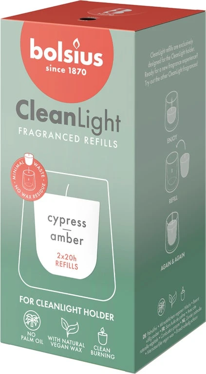 Deze CleanLight navulling van Bolsius heeft de geur Cypress & Amber. Cypress & Amber is een ontspannend en sereen parfum met aromatische balsem van cipres en tonen van ceder- en sandelhout en amber. Probeer ook de andere CleanLight-geuren!