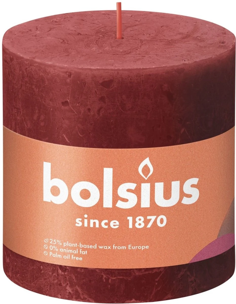 Deze Bolsius Rustieke Kaars in de kleur Delicate Red is gemaakt met liefde voor mens en planeet. Dus zonder palmolie en dierlijk vet maar met plantaardige wax. De kaars bestaat voor 25% uit plantaardige wax afkomstig uit Europa.
